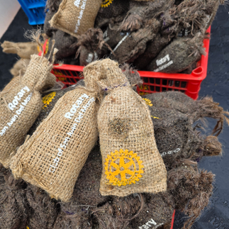 This simple, low-cost approach anchors seeds securely in sediment, shielding them from strong currents and erosion. The biodegradable natural-fiber bags-printed with the Rotary logo in water-based inks— create a stable cradle where young plants can take hold. Today, thousands of seed bags rest on the seabed, and diver-members have begun to witness a beautiful sight: fresh green shoots pushing upward, reclaiming their place in the sunlit shallows.
